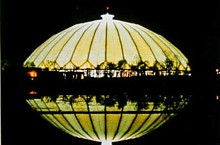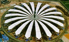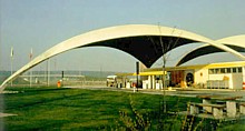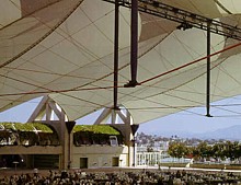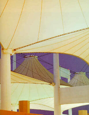 Membranes Since the 1960's, Frei Otto, Horst Berger, and David Geiger championed the idea of using fabrics for architectural structures. Their unassailable argument was that only fabric membranes are truly lightweight, so only membranes are suited to spanning large areas. Membranes - inflated by air pumps, stretched over tent poles, or hung from exterior scaffolding- are desirable for their quick construction and disassembly, their translucence, and their startling appearance. Membranes are now strong, permanent, fireproof, and insulated. In the United States there are more than 250 large, permanent membrane structures, in cold climates as well as warm ones, delivered on schedule and on budget to their occupants, signed off by fire and building inspectors, and insured by companies not known to be cavalier with money. In short, they are buildings. | ||