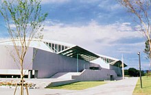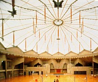 Hybrids Separate structural systems are well understood: not so well studied is how they can be combined in hybrids. As with plants, good hybrids are not genetic monsters, but sly superimpositions of capabilities. Hybrid buildings subtly alternate between two intertwined structural systems, one for normal loads and another that can respond to new circumstances with latent strengths. In the Sakata Gym, built in the high snow region of the Yamagata Prefecture in 1991-92, Masao Saitoh and architects Taniguchi and Associates, solved a complex and difficult loading problem. During the winter, snow loads can be double the self-weight of the roof, yet the site of the gym, a park with an existing small art gallery located in the midst of rice fields, required a flat roof. To build a flat or slightly curved roof that spanned the required 53 meters, a conventional truss would have to be massive, very deep, visually oppressive, and out of character with the delicate park buildings and setting. The solution was to design two structures for the two different loading conditions and allow the building to convert from one to the other, to inhale and exhale with the rhythm of the seasons. | ||