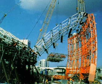 Deployable Structures An old problem for designers is how to avoid building structures twice: once in the form of a wasteful, dangerous, temporary scaffolding, and again in the final material. Now new technology fully solves the old problem of how to build a roof when there is not already one to stand on. ![]() World Memoral Hall in Kobe, Japan. Mitsumne, architect; Mamoru Kawaguchi, engineer. (Photo: Mamoru Kawaguchi) A distinction must be made between prefabrication and deployment, as all architecture is prefabricated to some degree; ore for steel girders is not mined, smelted, or forged at a Manhattan building site. Deployment concerns not the premanufacture of elements but the more or less complete pre-assembly of an entire structure in a factory, the collapsing of the structure for shipping, and the unfurling or deploying of the structure on site. | ||